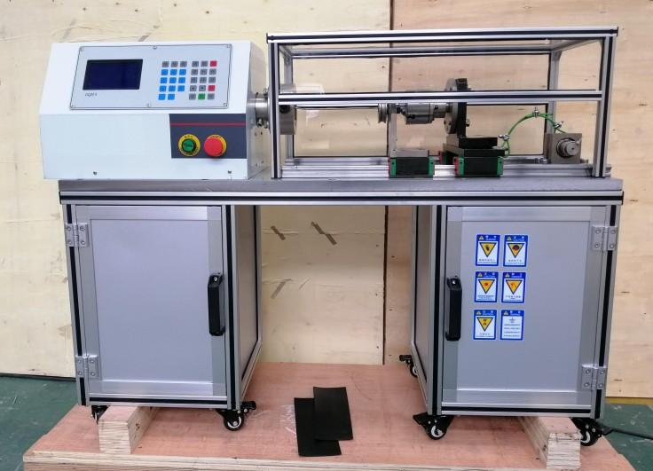 該機型采用高性能交流電機作為動力輸出,配以高精度減速電機,從而使動力能平穩輸出。電機的驅動采用高可靠、高穩定變頻器,提高機器運行的平順性,降低功耗。一側夾頭固定在電機輸出軸,另一側夾頭固定在可移動軸承座。移動座采用直線軸承,摩擦阻力小,保證了軸向移動的平直度。軸向拉緊力采用砝碼施加,通過10:1的L型杠桿,將作用力施加在線材上。